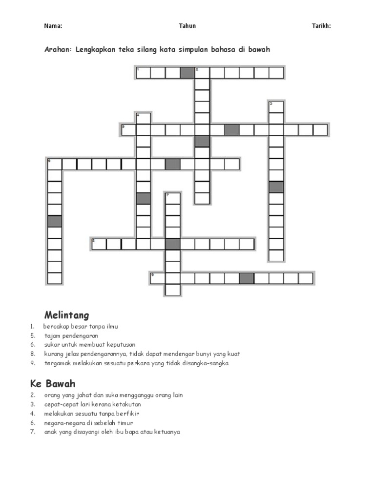 We are a sharing community. Pertambahan silang kata akan dilakukan sehingga mencapai 1000 silang kata. Please fill this form, we will try to respond as soon as possible. 8757 keputusan untuk 'teka silang kata bahasa melayu'. Nama guru bahasa melayu anda Use the download button below or simple online reader. Baiklah, dipendekkan cerita berikut ialah perkongsian seperti yang dijanjikan iaitu pelbagai teka silang kata bahasa melayu pdf. Savesave teka silang kata bahasa melayu for later. Cabar diri anda untuk melepasi halangan teka silang kata ini. Download teka silang kata kemerdekaan. Jom dapatkan teka teki silang kata dalam bahasa melayu ini. Menulismenconteng.my picture pelbagai teka silang kata bahasa melayu peralihan yang sangat ini dipetik dari sumber berikut. Kami menyediakan hampir 214 koleksi silang kata yang pasti menarik perhatian dan menghiburkan anda!