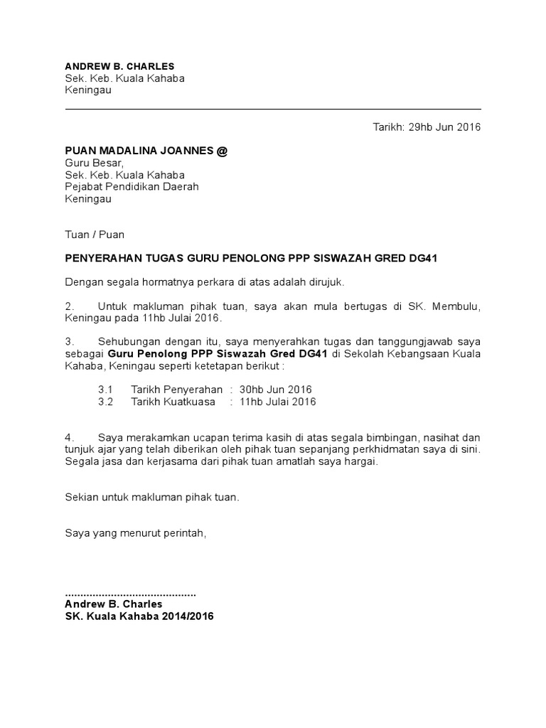Berikut merupakan contoh sofcopy yang disediakan untuk dimuaturun. Bagi seorang guru yang berpindah sudah pastilah wajib membuat nota serah tugas ini, supaya segala tanggungjawab yang dipikul sebelum ini dapat diamanahkan. Bagi pegawai yang berhenti sila berurusan dengan unit perjawatan berkaitan notis berhenti dan sekiranya melibatkan pembayaran. Kedudukan terakhir tugas tugas yang belum diselesaikan (nyatakan peratus tugasan yang telah disiapkan dan yang belum disiapkan) 4. Senarai tugas jawatan ii 3. Ketua setiausaha negara tan sri dr. Contoh nota serah tugas perpindahan guru menyerah 20 surat tanda terima / uang barang berita acara. Surat penyerahan dan akuan nota serah tugas 2. Untuk cikgu yang dapat pertukaran bolehlah download nota serah tugas untuk membuat persaipan bertukar ke sekolah baru. Manakala bagi cikgu yang permohonannya belum diluluskan jangan putus asa, cuba membuat rayuan dengan surat rayuan pertukaran. Sedutan majlis serah tugas kp rela malaysia ybhg kpjr zulkifli abidin. Surat penyerahan dan akuan terima nota serah tugas. Kandungan perkara muka surat 1.