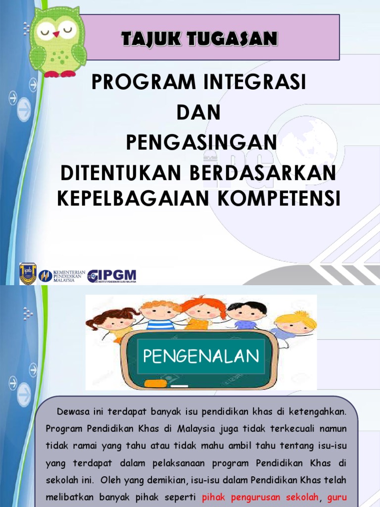 Program pendidikan khas di malaysia dilaksanakan melalui pendidikan khas di malaysia adalah satu usaha yang berterusan untuk melahirkan insan yang berkemahiran, berhaluan, berupaya, beriman, berdikari, mampu merancang dan menguruskan kehidupan serta menyedari potensi diri. Pendidikan khas di malaysia adalah satu usaha yang berterusan untuk melahirkan insan yang berkemahiran, berhaluan, berupaya, beriman, berdikari, mampu merancang dan menguruskan kehidupan serta menyedari potensi diri sendiri sebagai seorang individu dan peroduktif selaras. Pendidikan malaysia boleh didapatkan dari sekolah tanggungan kerajaan, sekolah swasta atau secara sendiri. 3.0 program inklusif di malaysia program pendidikan khas diperkenalkan atas saranan dan gesaan beberapa deklarasi diperingkat antarabangsa. Di antara deklarasi yang menjadi dasar kepada pendidikan khas di malaysia adalah the framework for action on special needs education.